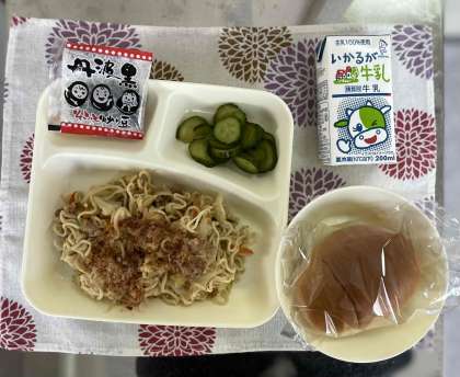 和風焼きそば、きゅうりのしょうがづけ、いり黒豆、黒糖パン(ハーブ)、牛乳です。