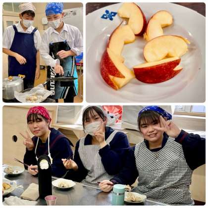 教育委員会のガイドラインに沿って安全と安心に配慮しての実習です。特に、班で調理をするのですが、自身のものは自分で作っています。写真には外してもらいましたが、リンゴの飾り切りも、1つずつに付箋を付けていました。子どもたちは、とても楽しそうでした。ご家庭でも再現してもらってください。