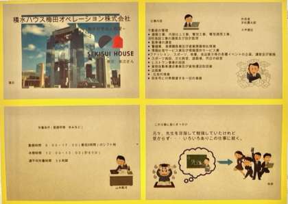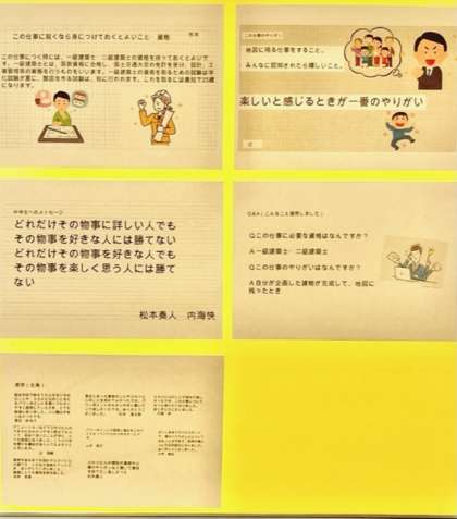 プレゼンテーション成果物は、1年生教室の前に掲示されています。一つひとつのプレゼンテーションを読むと、とても興味深く、良く学べていることがよくわかります。自身が受けた職業講話だけでなく、他の発表の様子も感じられます。