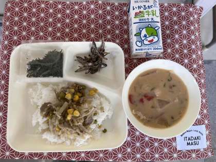 きんぴらちらしご飯、ぞう煮、ごまめ、牛乳です。