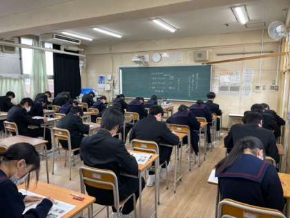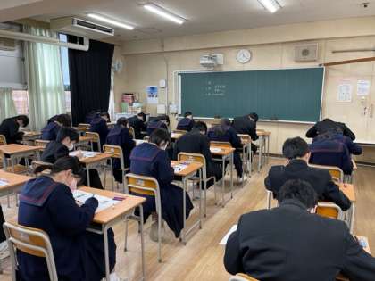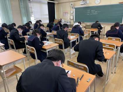 3年生は、本日から3日間、学年末テストです。教室の黒板に担任の先生からのメッセージがありました。「最後のテストです。悔いののこることのないよう、やりきろう。」