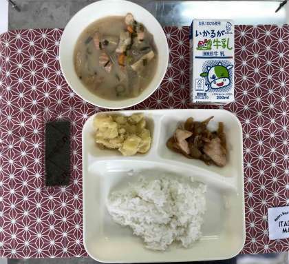 鶏肉の甘辛焼き、かす汁、栗きんとん、焼きのり、ご飯、牛乳です。