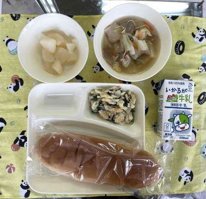 ホタテ貝のグラタン、スープ、和なし(缶)、黒糖パン、牛乳です。