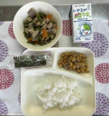 ご飯、筑前煮、じゃこ豆、焼きのり、牛乳です。