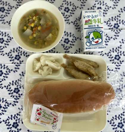 わかさぎフライ、コーンと白菜のスープ、カリフラワーのサラダ、コッペパン、りんごジャム、牛乳です。
