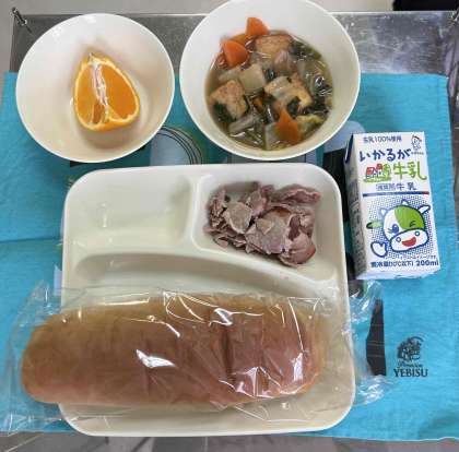 豚肉のオイスター焼き、あつあげと野菜の中華煮、デコポン、黒糖パン、牛乳です。