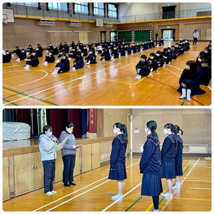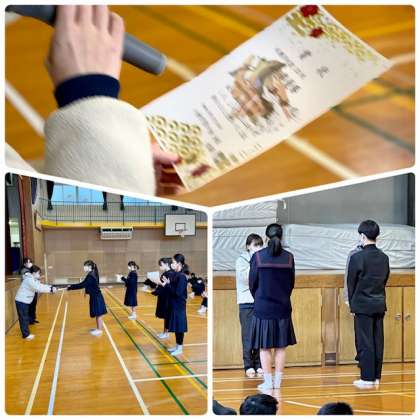 今朝は2年生が体育館で学年集会を行なっています。先週行った「百人一首大会」の表彰をしました。個人・学級での表彰です。