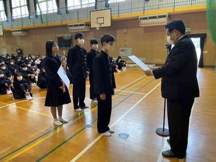 バドミントン部のなにわジュニア第2支部大会での優勝等の表彰、よい歯の表彰と歯と口の標語の参加賞の表彰がありました。おめでとうございます!