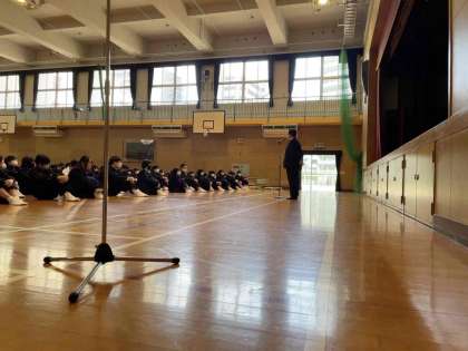 毎週月曜日は全校集会ですが、本日はグラウンド状況不良のため、体育館でおこなっています。