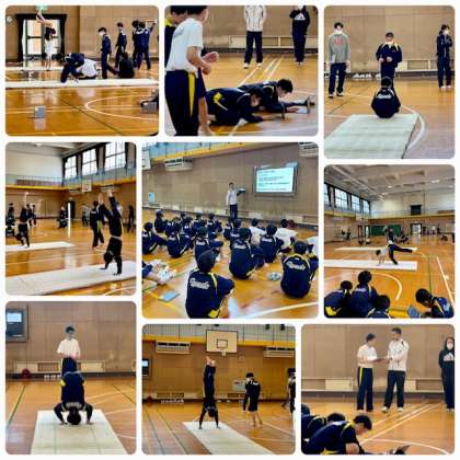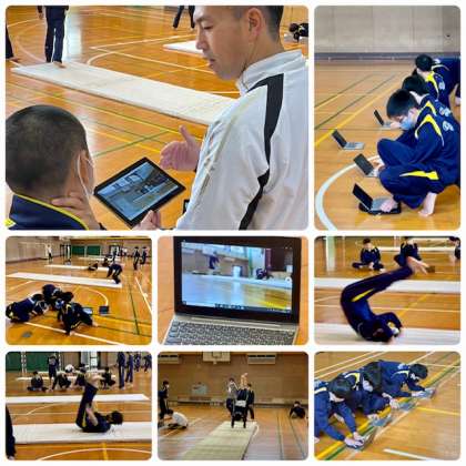 2年生保健体育(男子)の授業の様子です。進藤先生がマット運動の研究授業を行いました。今日はマット運動の実技テストです。授業は、体育委員を中心に主体的に進めらました。生徒は1人1台パソコンで課題を撮影しながら授業は進みます。実技テストは撮影した動画を提出して評価されます。生徒にとって1回限りの演技では、プレッシャーが多くかかるので自分が納得した評価が得られやすいと思いました。授業の様子を沢山の先生方にも参観していただきました。とても良い研究授業でした。