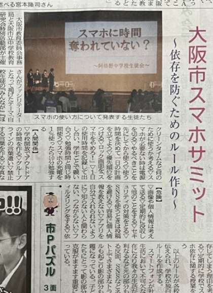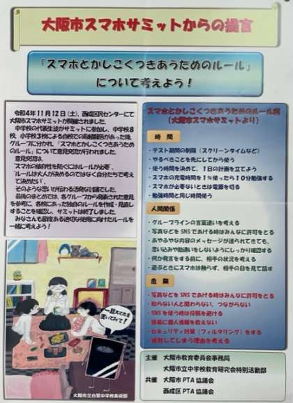 本日、配布の大阪市PTAだよりにも記事が掲載されています。保護者の皆さまにおかれましては、お子さんと共にご一読いただき、様々な課題についてお話をしていただきたく思います。