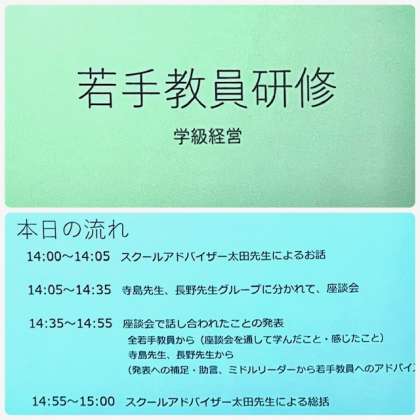 メンターの和田先生、中川先生が計画してくださいました。今回は、学級経営をテーマにミドルリーダーの寺島先生、長野先生を中心に若手教員同士が、学級経営の課題などを出し合い高めました。