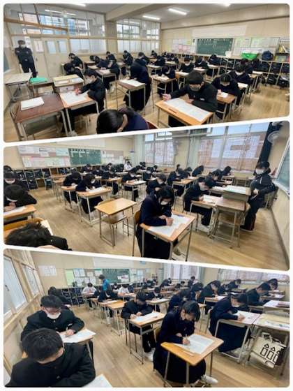 1・2年生の学年末テストは今日が最終日です。写真は2時間目保健体育科のテストの様子です。実技試験だけでなく、ペーパーテストにも真剣に取り組んでいます。
