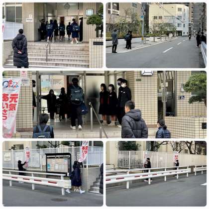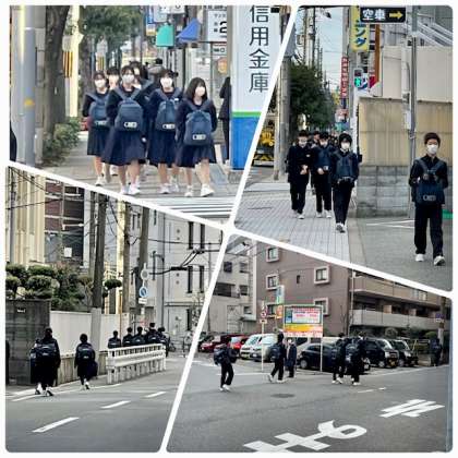 登校時の様子です。毎朝、教職員が手分けして登校指導にあたっています。