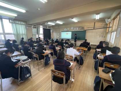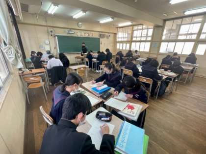 5時間目の2年生の様子です。1組は数学、2組は社会、3組は国語の学習です。国語は先週行った「走れメロス」のビデオを見て振り返りをしていました。