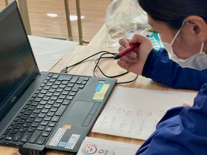 サポート学級の米原先生は、リモートワークで数学の授業を行なっていました。個別最適な学びを進めています。