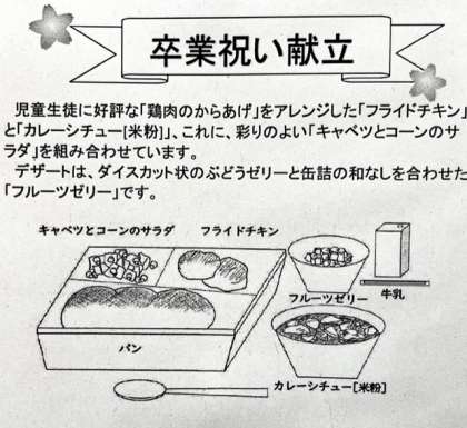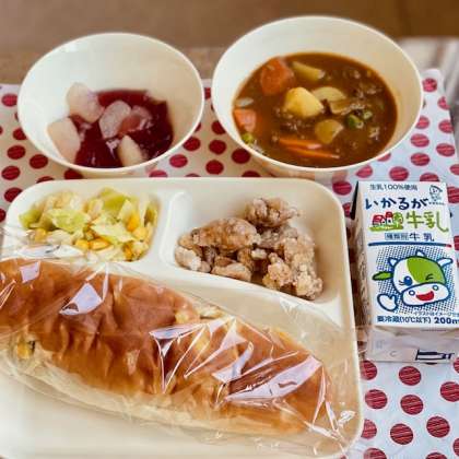 フライドチキン、カレーシチュー(米粉)、キャベツとコーンのサラダ、フルーツゼリー、おさつパン、牛乳です。