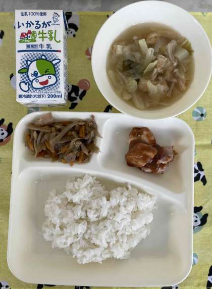 鶏肉のみそバターソース、五目汁、きんぴらごぼう、ご飯、牛乳です。