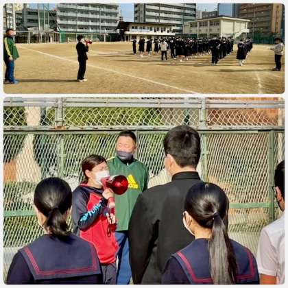 今朝は、グラウンドで2年生が学年集会をしています。