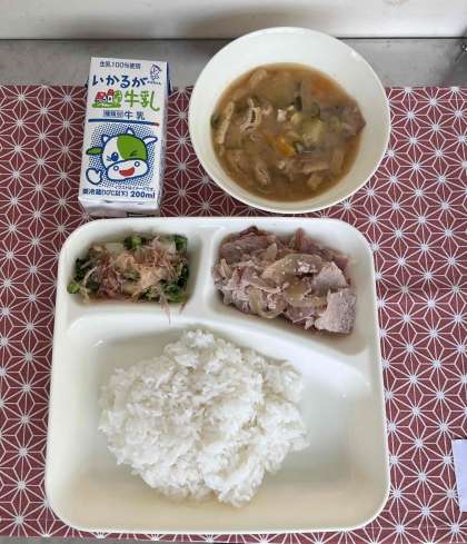 豚肉のしょうが焼き、さつまいものみそ汁、菜の花のおひたし、ご飯、牛乳です。