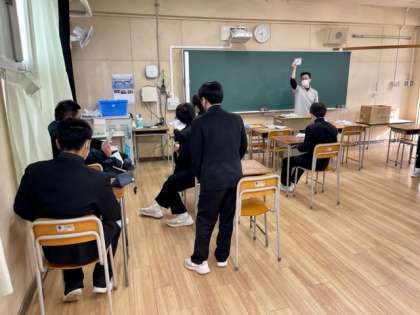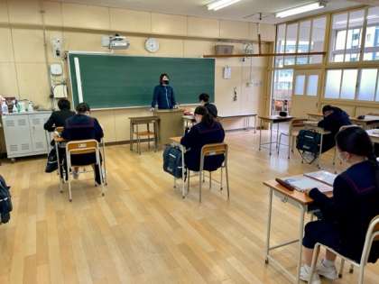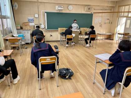 3年生の朝の教室です。公立高校一般選抜受検者の机は廊下に出しています。授業終了後、受検者以外の生徒で教室のワックス掛けを予定してます。