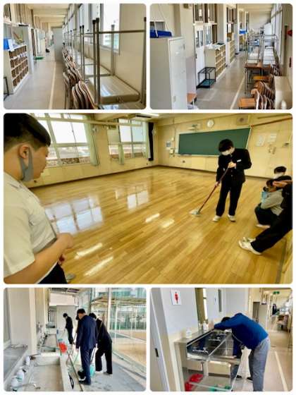 3年生は、教室整備とワックス塗布を行ってくれています。ワックス塗布学校済んだ教室はピカピカに光っています。ワックス塗布後はモップも綺麗に洗ってくれました。トイレ前の手洗い台も山田先生がピカピカに磨きあげてくださいました。