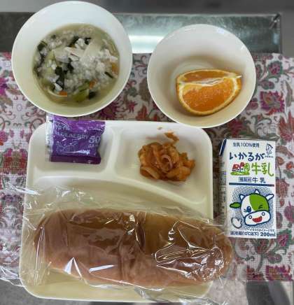 えびのチリソース、中華がゆ、デコポン、コッペパン、ブルーベリージャム、牛乳です。