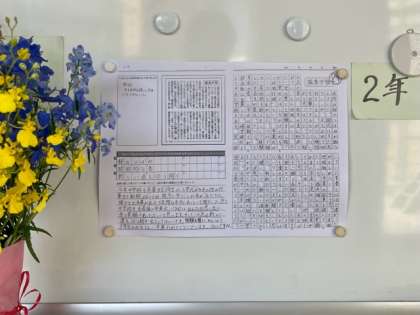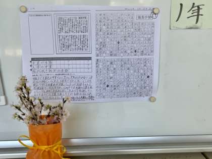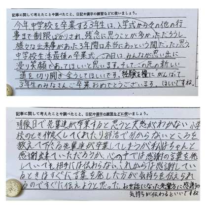 職員室前の掲示板に新聞の「書き写し」の各学年の秀作が掲示されています。今回は「近所の桜のつぼみが膨らんでいた。・・・」とはじまるコラムです。この記事を読んで、今週卒業していった、先輩たちに書かれていました。