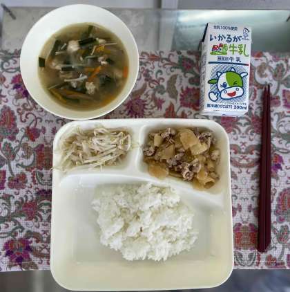 豚肉のコチジャンいため、鶏肉と春雨のスープ、もやしのナムル、ご飯、牛乳です。