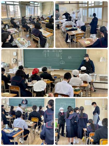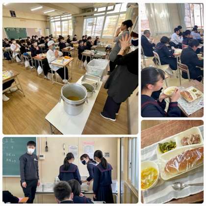 1年生の給食の様子です。「小学校と比べてパンが大きくなった。」「美味しい!」と生徒から声が上がっていました。しっかり食べてください。