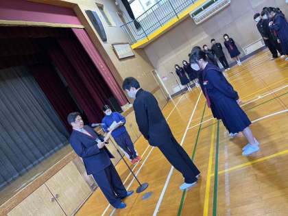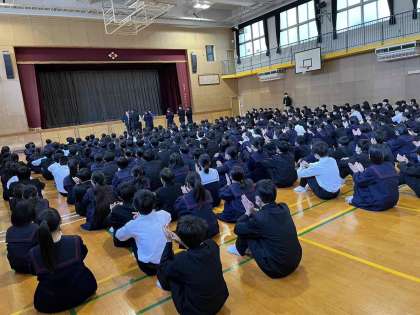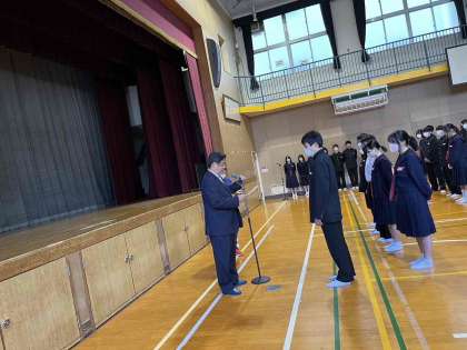 本日は昨日の雨のためグラウンド不良で、体育館にておこなっています。こちら、前期学級委員の認証式です。