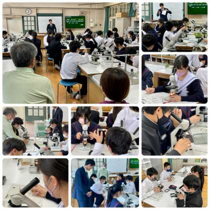1年4組理科の学習です。顕微鏡を使った水の中の微生物の観察です。高原先生をはじめ松瀬先生、西澤先生の3人で指導くださいました。西澤先生は小学6年時に1年間授業を担当されていたので生徒の中には親しみを持って話してくる様子も見られました。