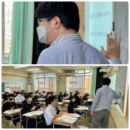 1年2組 数学の学習です。山田先生の説明にしっかりと耳を傾けています。眼差しも真剣です。内藤先生と2人でご指導いただきました。