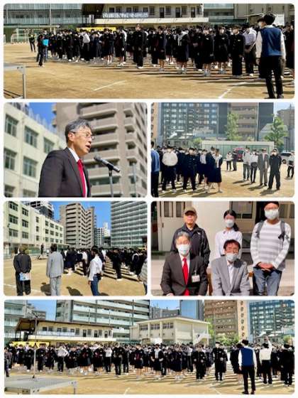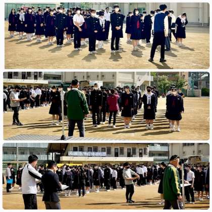 午前9時、地震・津波避難訓練が始まりました。地震発生の放送遠きっかけに、教室では担当の先生から「机の中に避難しなさい。」のお声が響きました。揺れがおさまるまでの間、生徒は机の中に身体(頭部)を入れて、揺れのおさまるまで待ちました。その後揺れがおさまりました。「運動場に避難してください。」の放送を聞いて、整然と運動場に避難しました。避難に要した時間は2分40秒でした。訓練ではありますが、整然と避難することができました。前田昌則北区長様から講評を頂戴しました。校長先生のお話の後、津波に備えての垂直避難を行いました。