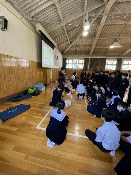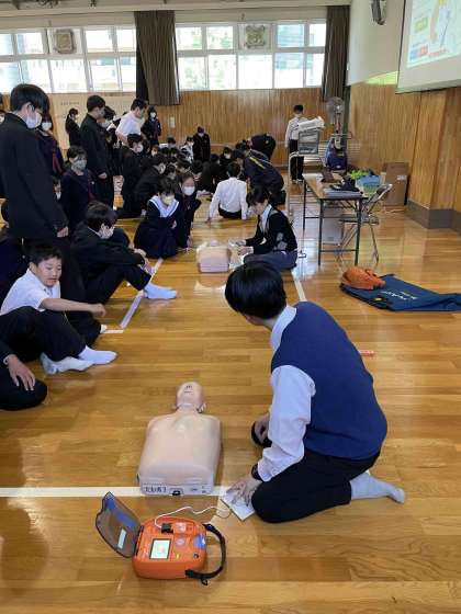 その後、胸骨圧迫とAEDのデモ機を使用して、実技をおこないました。