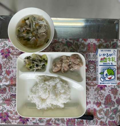 鶏肉のからあげ、中華スープ、チンゲン菜とモヤシいため、ご飯、牛乳です。