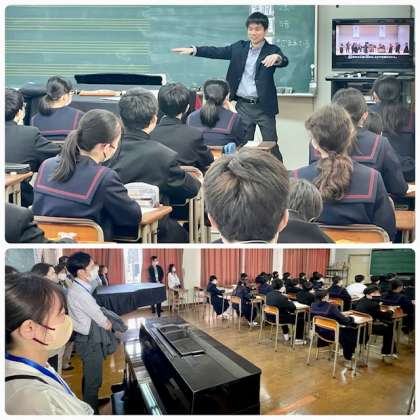 1年2組の音楽の学習です。ヴィヴァルディの「四季」を学習しています。先生は、音楽に合わせて体全体を使って表現していました。楽しかったです。