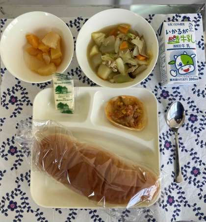 豚肉と野菜のカレースープ煮、変わりピザ、ミックスフルーツ、コッペパン、マーガリン、牛乳です。