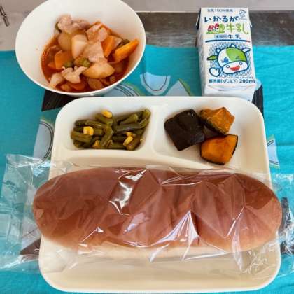 ケチャップ煮、三度豆とコーンのソテー、焼き南瓜の甘みつかけ、黒糖パン、牛乳