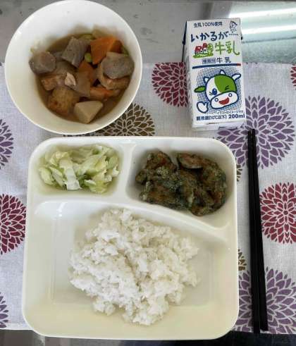 ちくわのいそべあげ、あつあげとサトイモのみそ煮、あっさりキャベツ、ご飯、牛乳です。