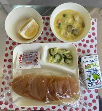 コーンクリームシチュー、キャベツときゅうりのサラダ、かわちポンカン、コッペパン、いちごジャム、牛乳です。