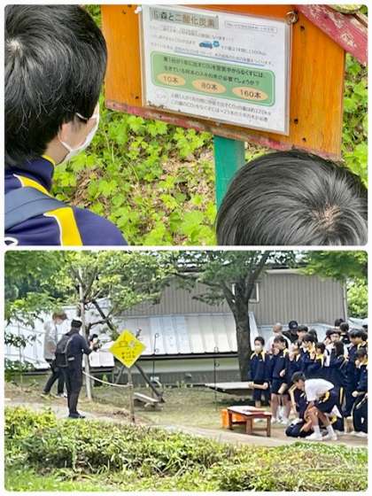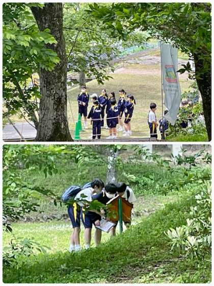 ロゲニングのグループです。林の中を地図を頼りにポイントを回って質問に答えています。