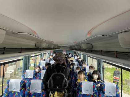 バスの中で、ウエットスーツの着方などを説明を受けてます。