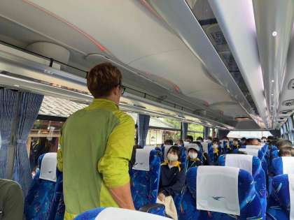 2組です。ラフティング体験のベースキャンプ、バス内でインストラクターさんからの説明を受けています。ウエットスーツに着替えて、いよいよ出発です。