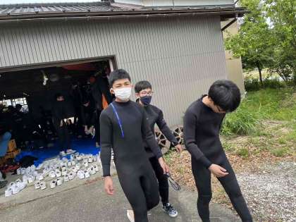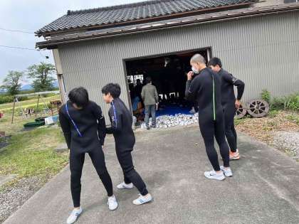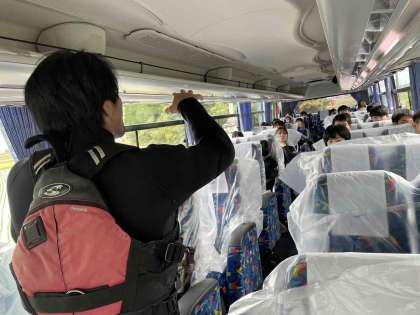 更衣が終わり、車内でやり方を教えてもらってます。 1組、2組もラフティングが始まります。