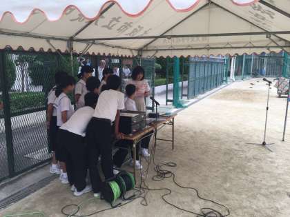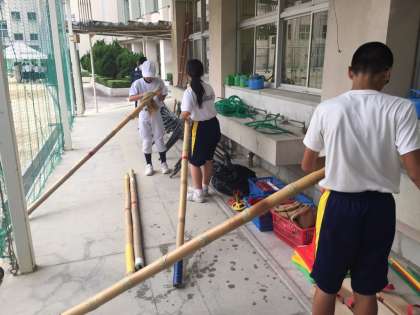 写真は放送委員の練習と棒引きの棒をふいているところです。