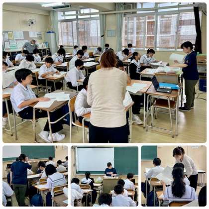 1年1組の英語の学習です。本日より着任された深江先生もご指導くださっています。サポートルームの西下先生も生徒の学習をサポートしてくださっていました。3人の先生で丁寧な指導をしています。