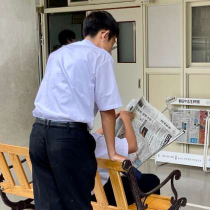 昼休みになって、小雨がパラパラと落ち始めてきました。校長室前の新聞閲覧ベンチで生徒が新聞を読んでいました。