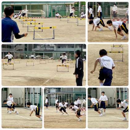 グラウンドでは、1年3・4組男子がハードル走をしています。時折りボツリと雨の雫が落ちてきますが、暑さは凌げています。