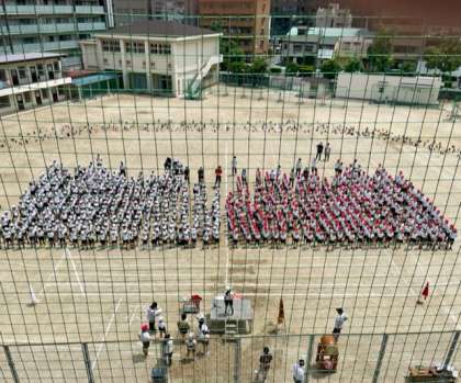 10時30分過ぎに、大淀小学校全学年児童の皆さんが、大淀中学校に到着して予行練習が始まりました。開会式、準備運動、応援合戦と進行します。校歌や応援の歌が校舎に響いています。